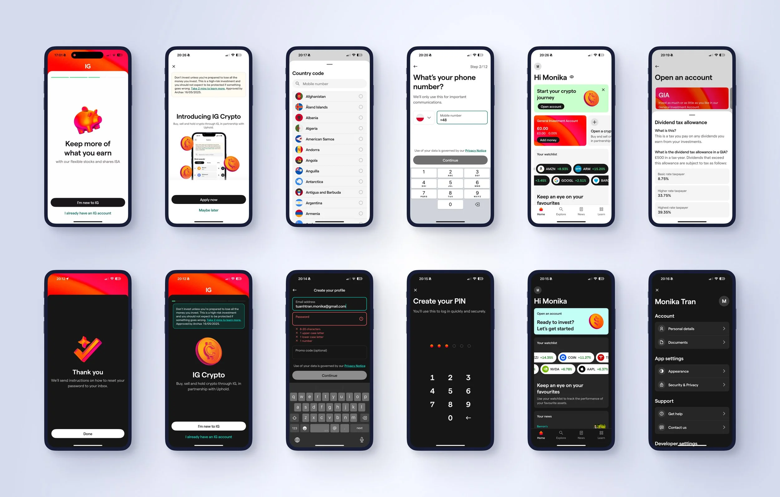 As a Product Designer at IG Invest (UK) and IG Markets (APAC) I took full ownership of onboarding flow, investing account creation (ISA, GIA, Pension in UK), setting up user profile, payments and costumer support.